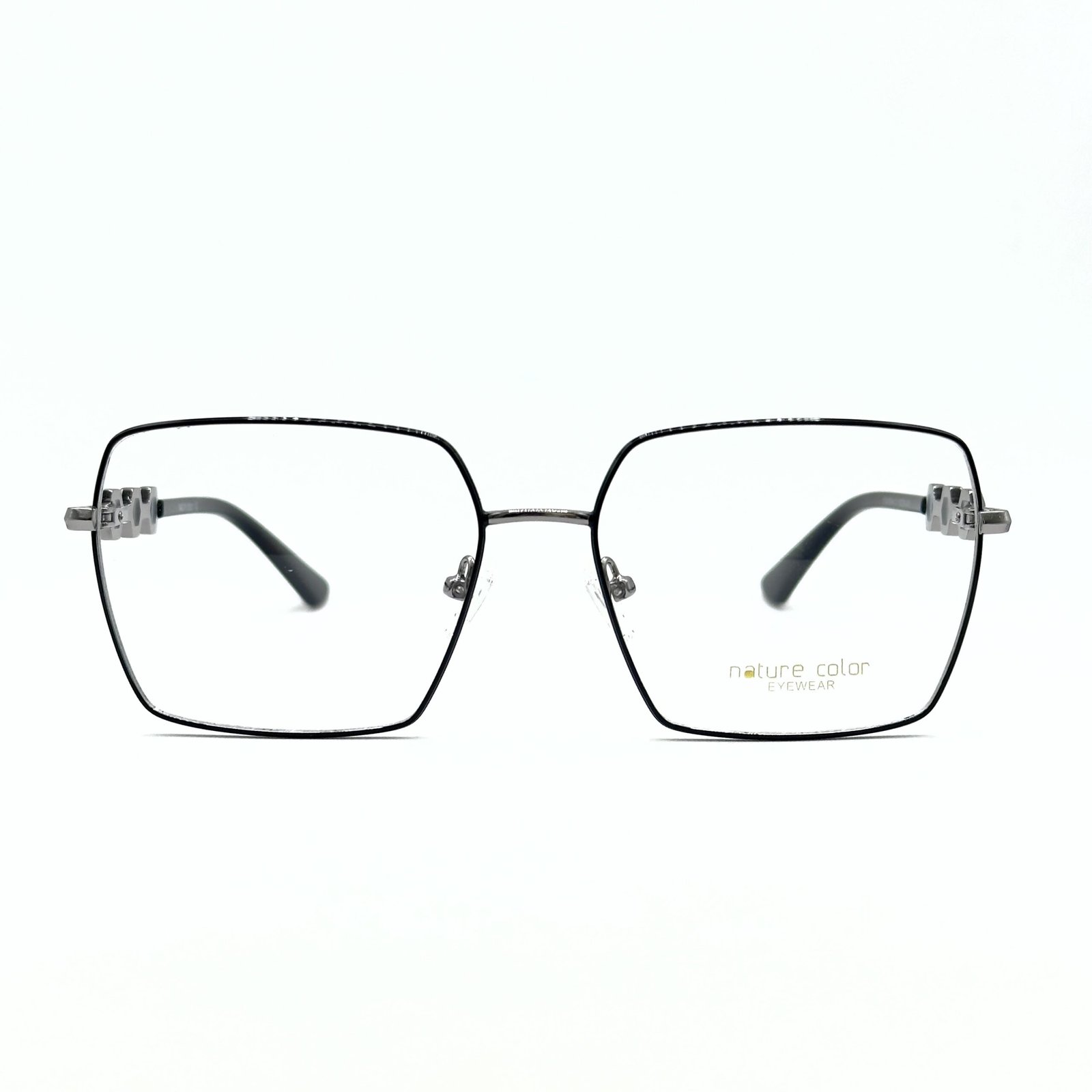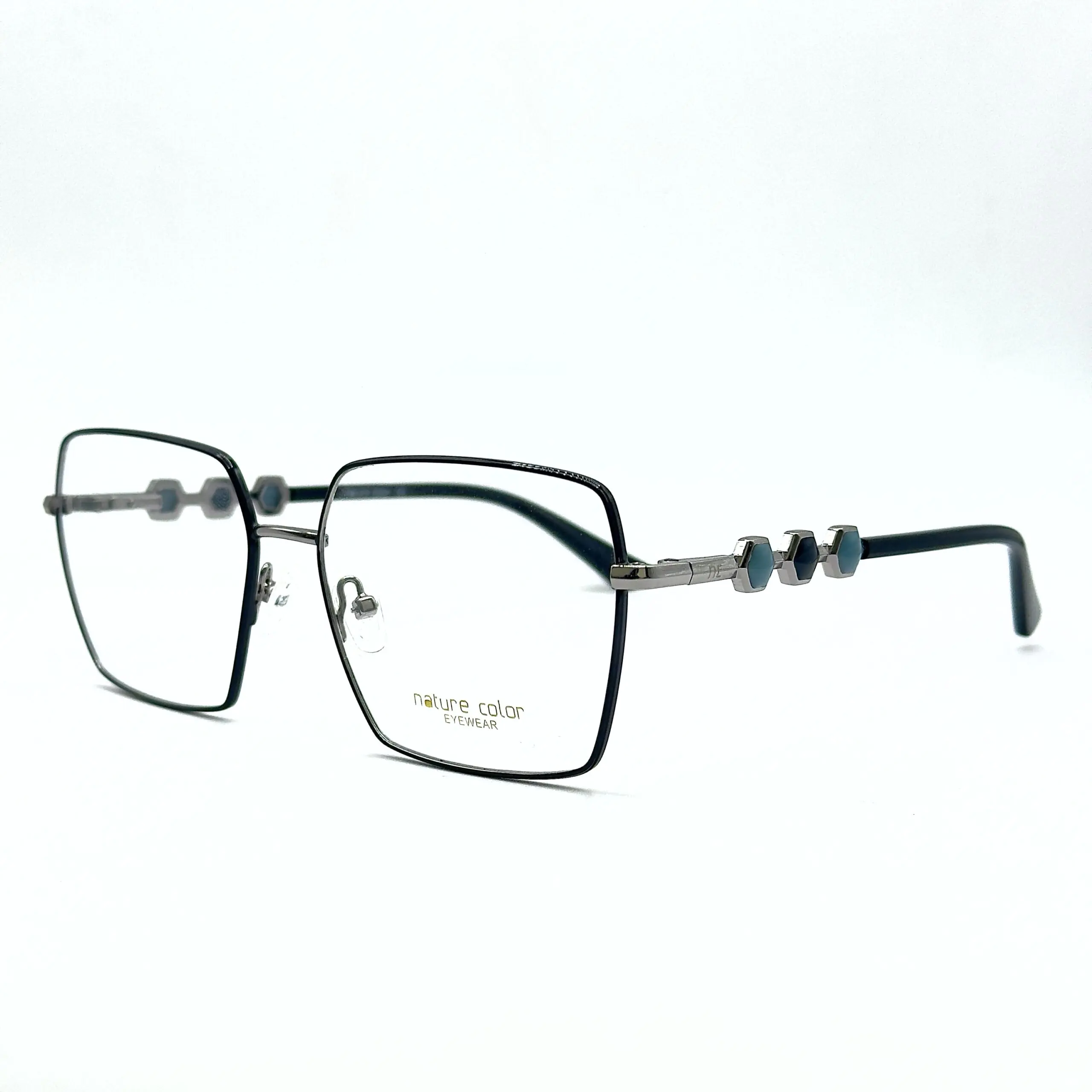Ces lunettes carrées au design raffiné présentent une monture en métal noir mat associée à des accents argent brillants. Les branches se distinguent par leurs motifs hexagonaux bleu-gris et argent qui apportent une touche unique et moderne.